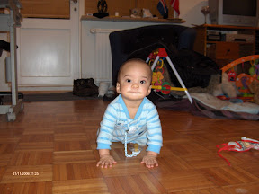 Even though he can not walk yet, he like to try. So we got him one of those walking chair thingy- ma-bobs and his racing all over the place. We'll get it on film so you can see.